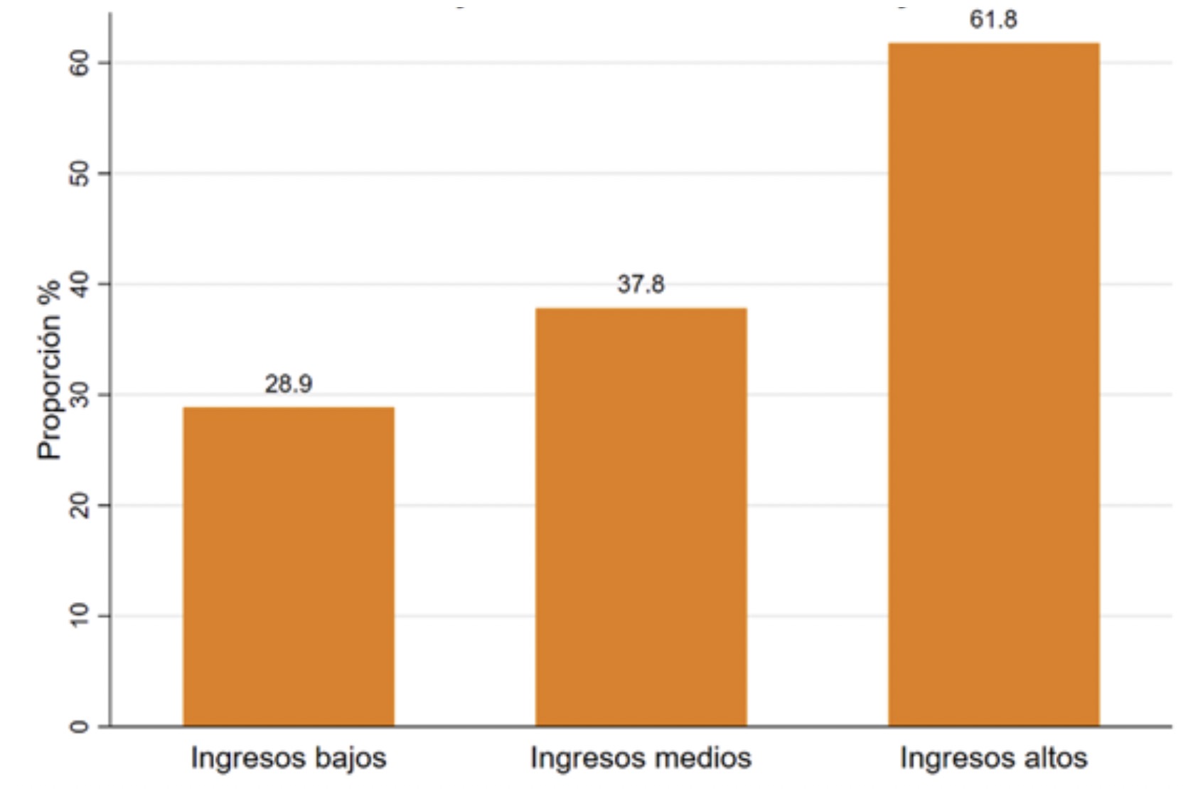 Una de las causas de estos efectos podría ser que trabajar desde casa es un lujo que muchos hogares de ingresos más bajos no pueden permitirse (véase Gráfico 2). Entre los trabajadores de ingresos más bajos que lograron mantener sus empleos, el teletrabajo no parece ser una opción. Esto puede ser causado por la segmentación laboral que hace más probable que las actividades que realizan los trabajadores de ingresos más bajos no puedan llevarse a cabo de forma remota.