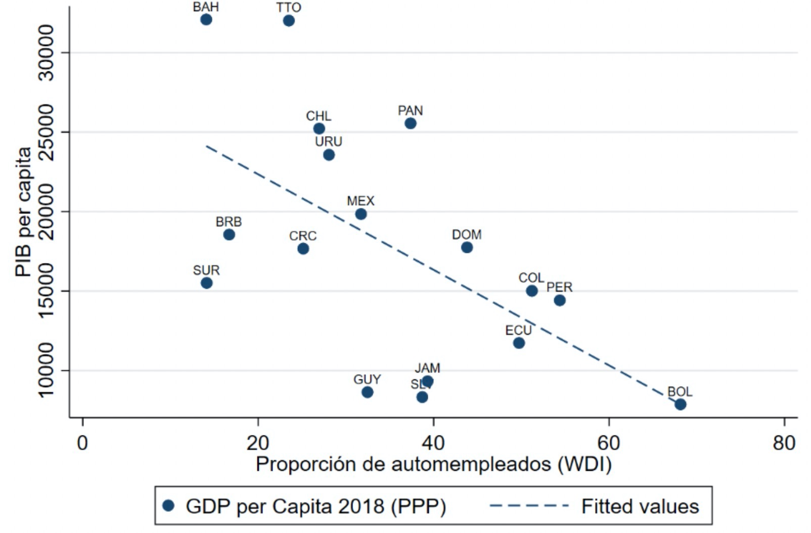Las menores proporciones de empleo autónomo se asocian con un mayor PIB per cápita.